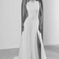 Destaca por su falda de tul ilusión con abertura lateral y larga cola.