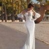 Vestido de corte princesa con escote en V y mangas largas, en crepe y chantilly, que combina romanticismo y grandeza en un vestido de gran presencia.