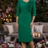 Vestido recto con cuello redondo y cerrado en espalda con cremallera invisible.