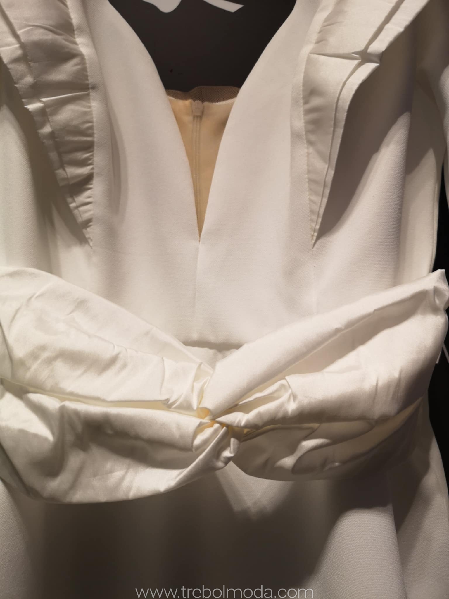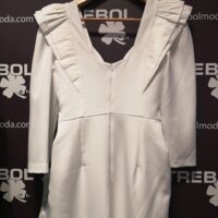 Destaca por sus volantes en los hombros (en mikado) y sus mangas 3/4.