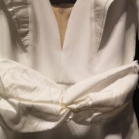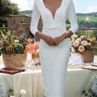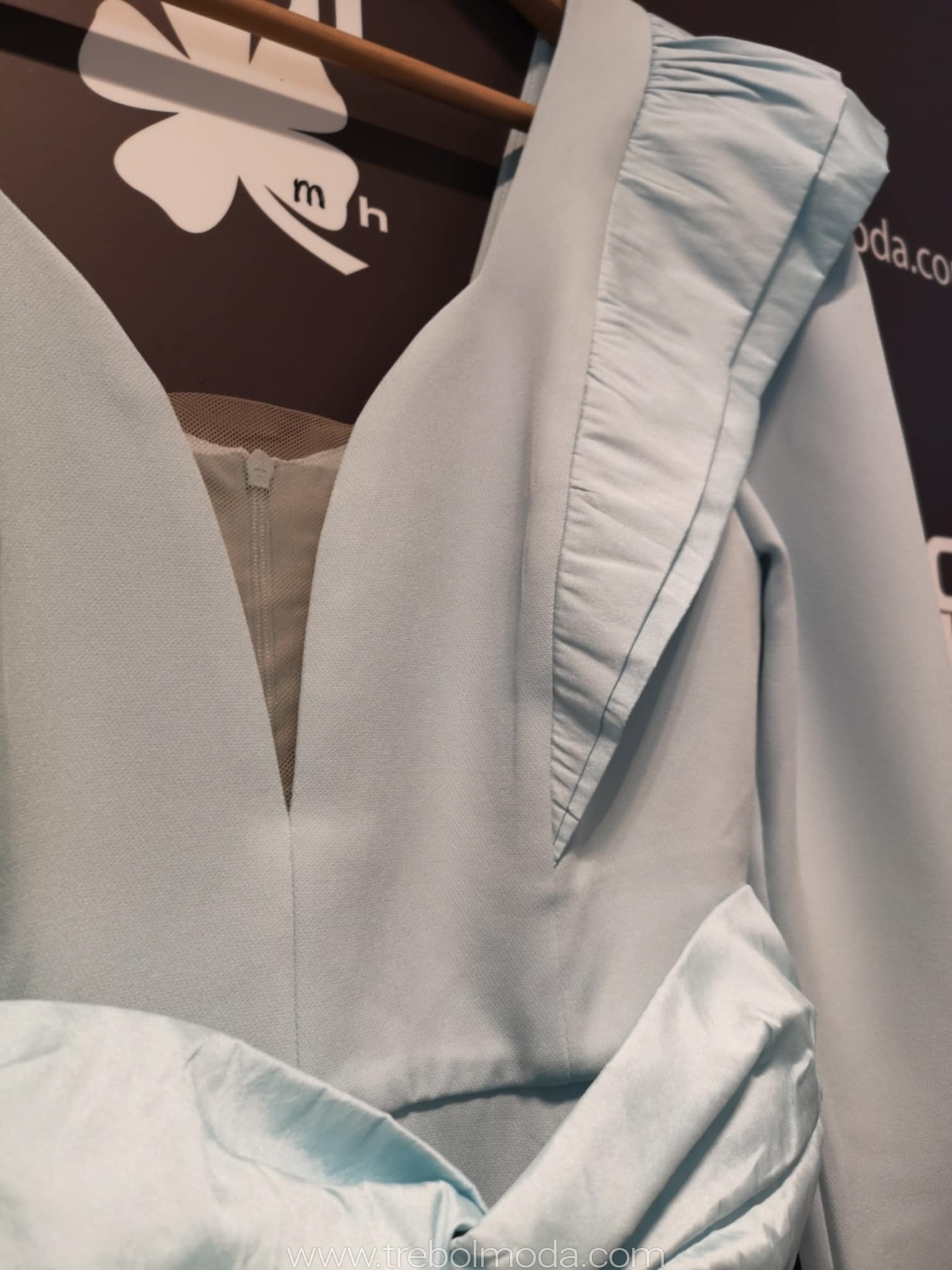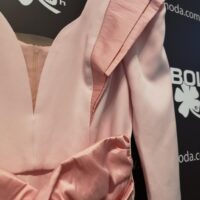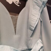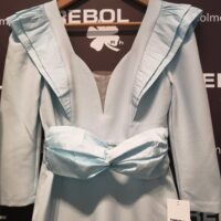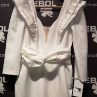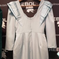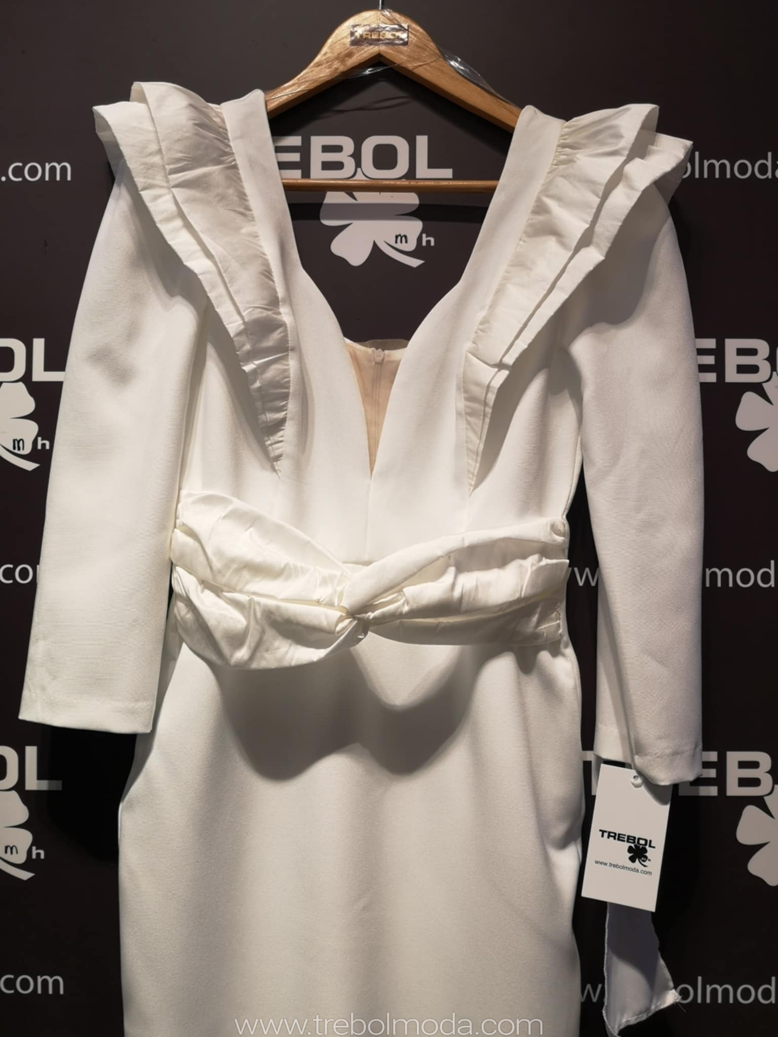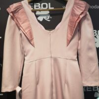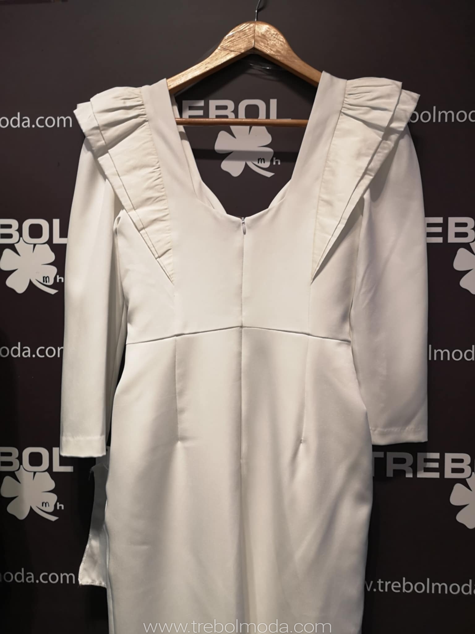 Destaca por sus volantes en los hombros (en mikado) y sus mangas 3/4.