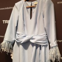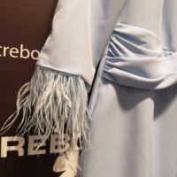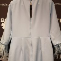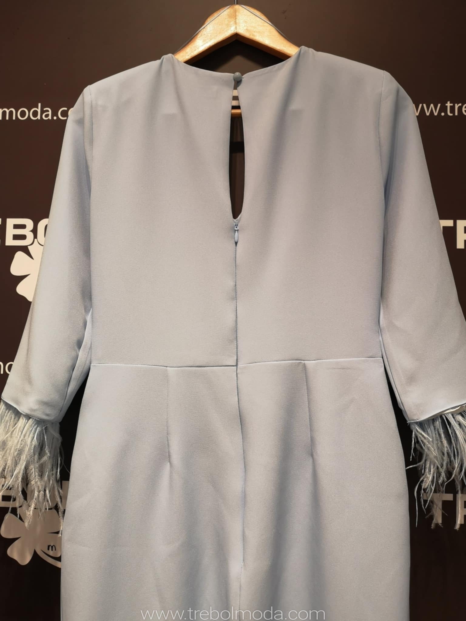 Destaca por sus mangas y sus puños con plumitas (desmontables, con broches).