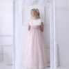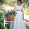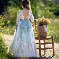Vestido de comunión elaborado en tul color natural, combinado con tul azul que aporta un toque delicado y elegante.