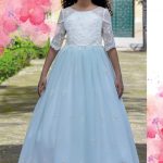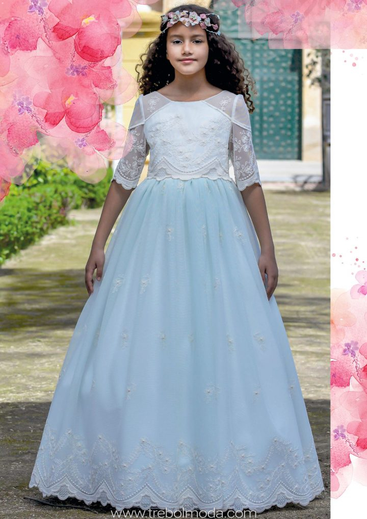 Un vestido muy dulce por su tono agua marina combinado en tul bordado beige.