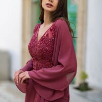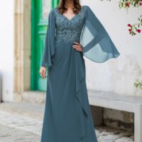 Este vestido fluido con capas de gasa en mangas es ideal para madrinas que buscan una combinación de sofisticación y movimiento. Las capas en las mangas crean un efecto visual impactante, mientras que el escote en V añade elegancia. Las capas, muy de moda esta temporada, aportan un toque actual y permiten un movimiento fluido.