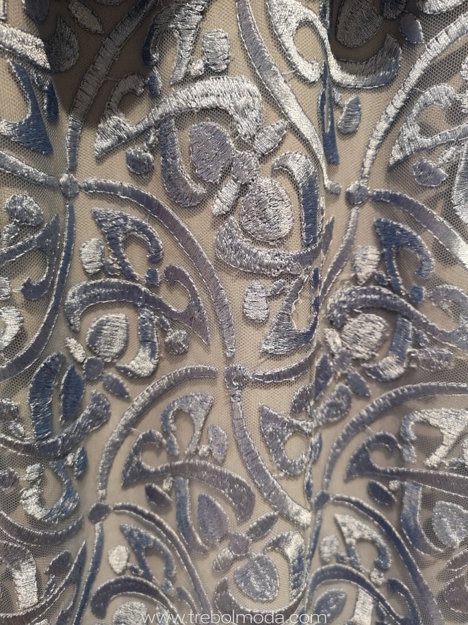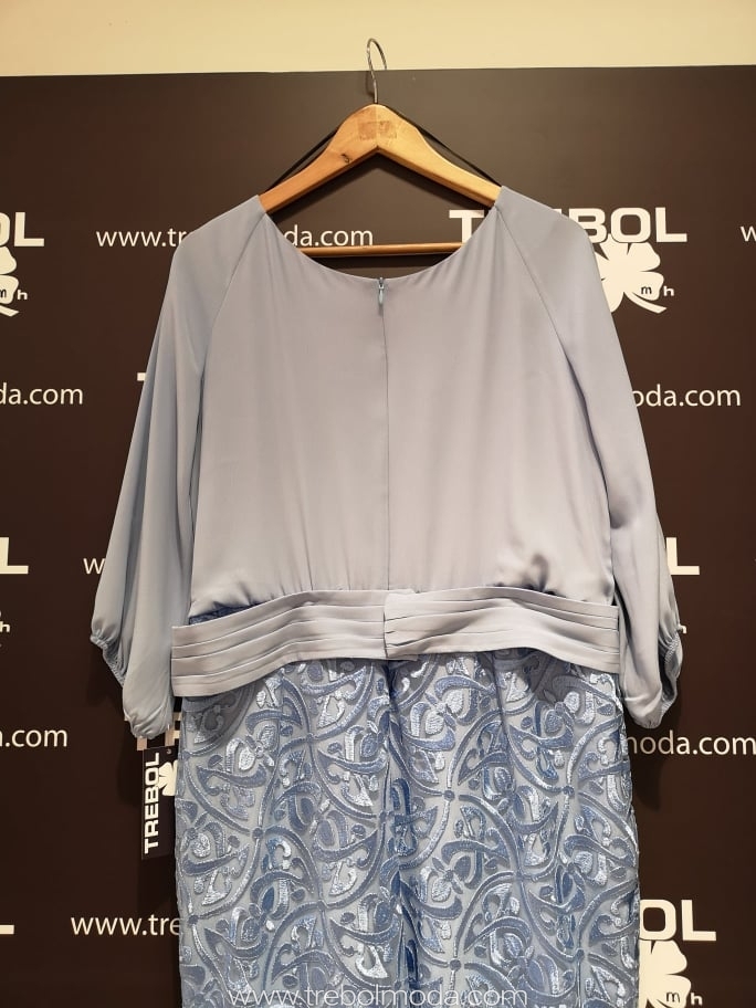 Vestido con efecto dos piezas.Confeccionado en dos tejidos: para el cuerpo de arriba una gasa (100% poliéster) y para la falda un tul bordado (100%poliéster). Cerrado en el centro de espalda con cremallera invisible. Incluye cinturón.