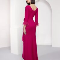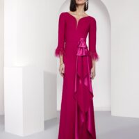 Este vestido de madrina en un vibrante color frambuesa destaca por su diseño moderno y sofisticado. Con un elegante escote en forma de corazón y mangas tres cuartos, el vestido presenta un detalle en la cintura con un drapeado que cae con suavidad. Las mangas con puños de plumas le dan toque de elegancia al conjunto. Ideal para bodas y eventos formales, este vestido ofrece una silueta estilizada y un estilo atemporal que resalta la figura.