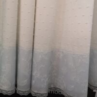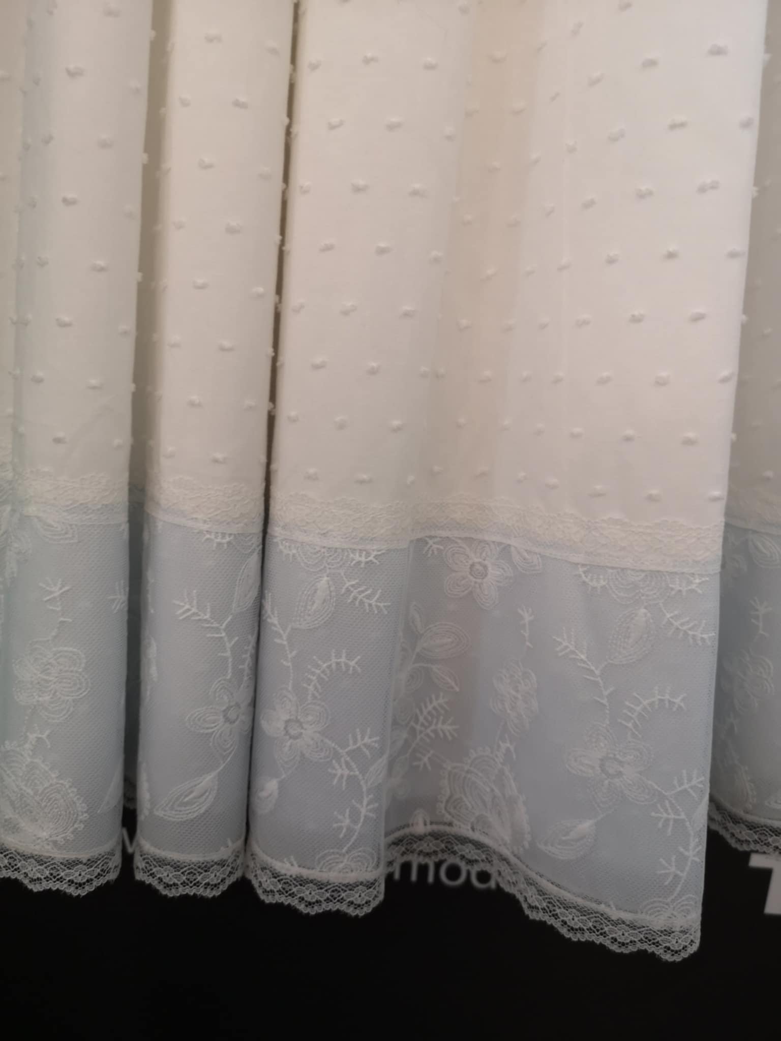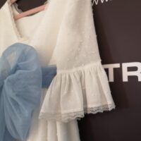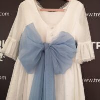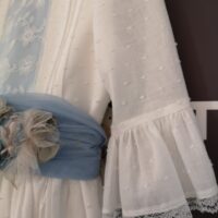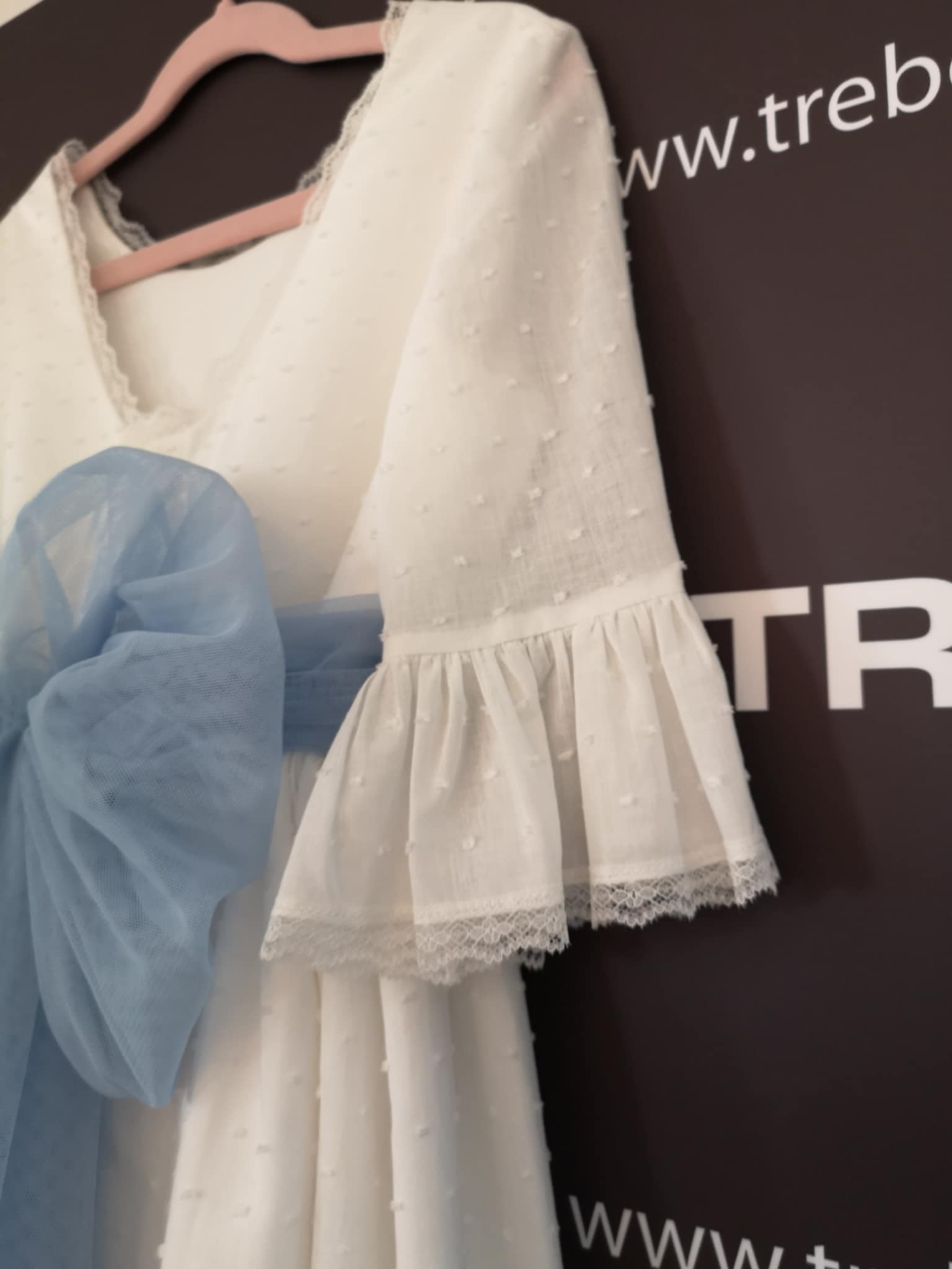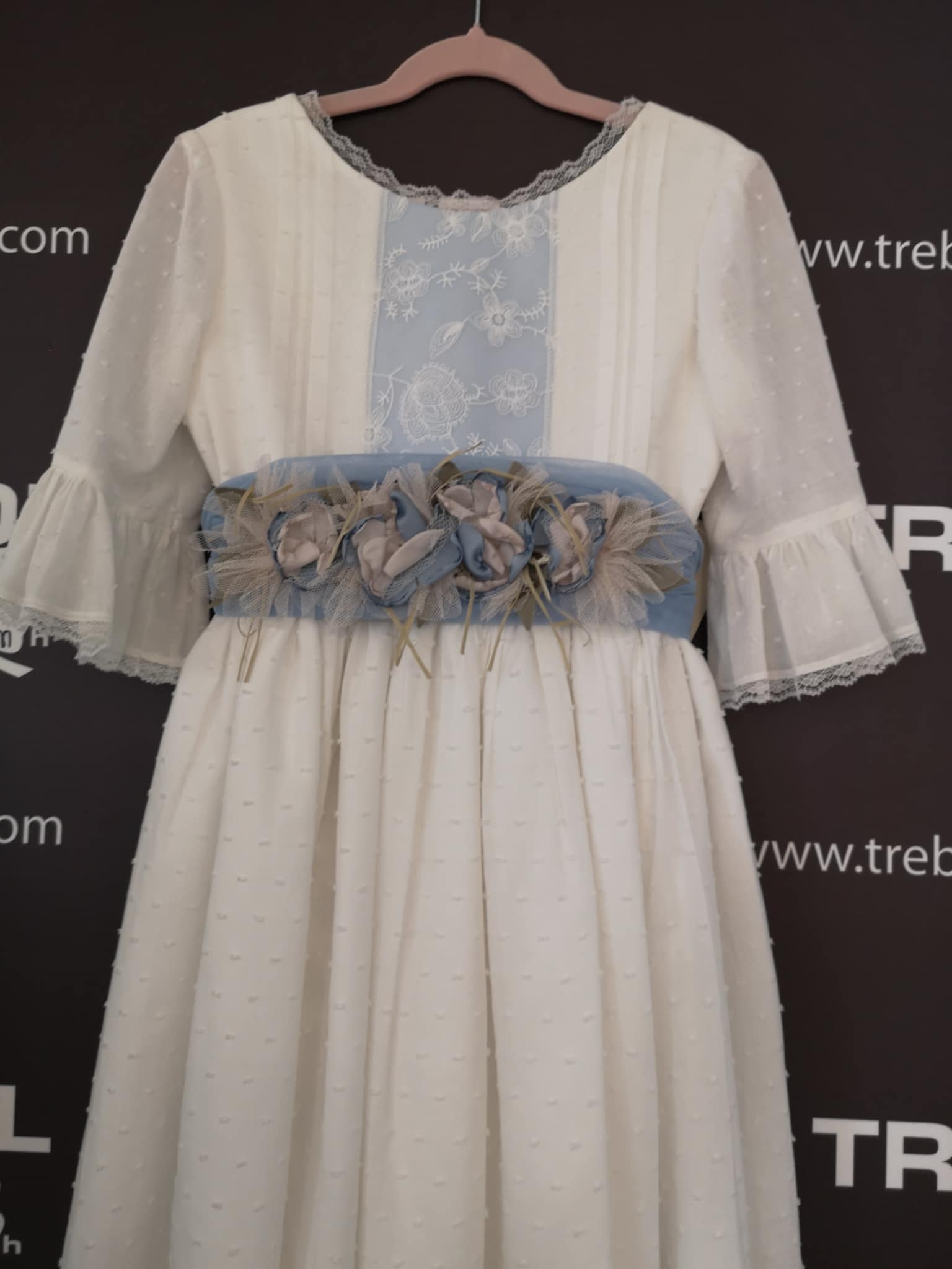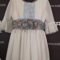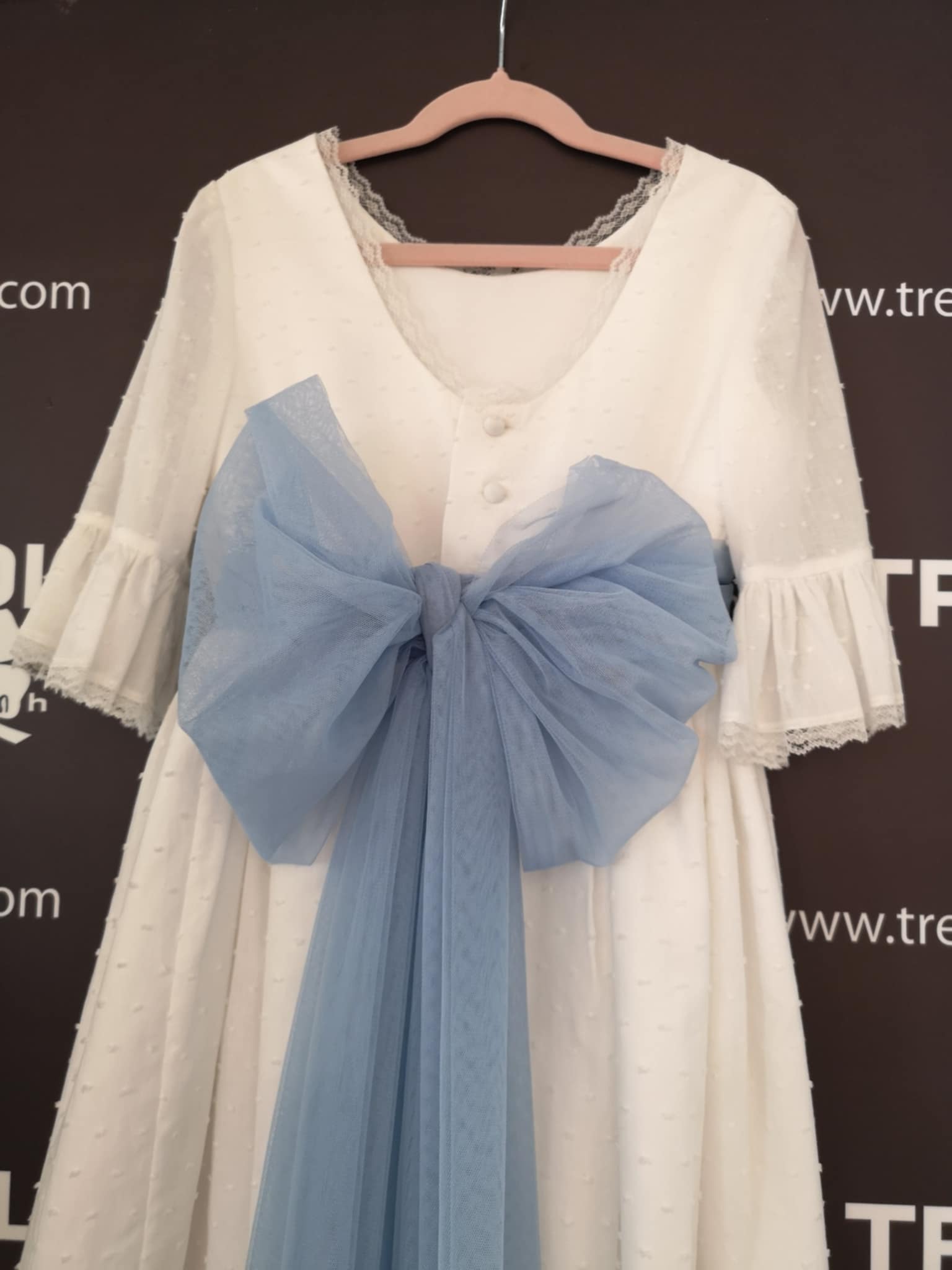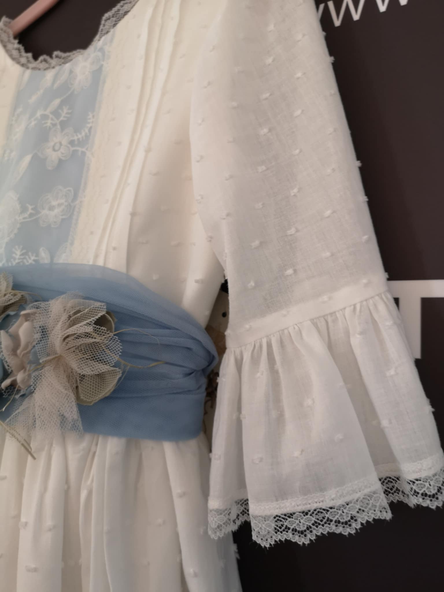 La falda, con rizo en la cintura y puntillas, se complementa con un cinturón de tul azul, creando un conjunto encantador y lleno de estilo para la ocasión especial.