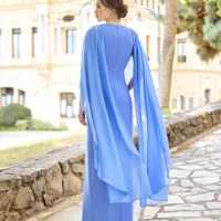 Este vestido fluido  con capas de gasa es ideal para madrinas que buscan una combinación de sofisticación y movimiento. Las capas en las mangas crean un efecto visual impactante, mientras que el escote en V añade elegancia. Las capas, muy de moda esta temporada, aportan un toque actual y permiten un movimiento fluido.