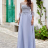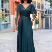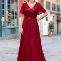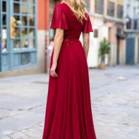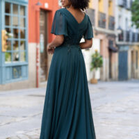 Este vestido fluido con capas de gasa es ideal para madrinas que buscan una combinación de sofisticación y movimiento. Las capas en las mangas crean un efecto visual impactante, mientras que el escote en V añade elegancia. Las capas, muy de moda esta temporada, aportan un toque actual y permiten un movimiento fluido.