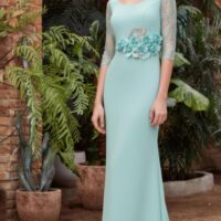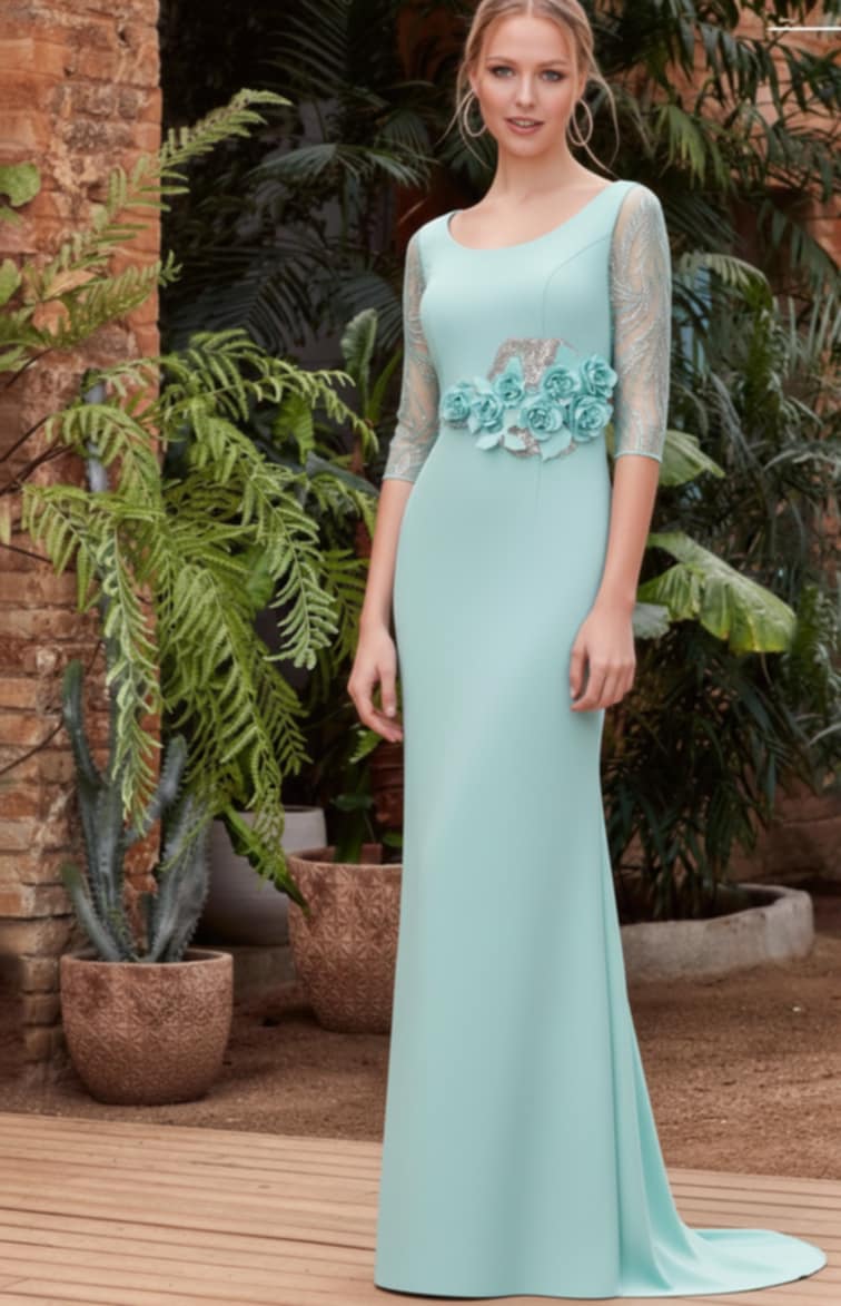 Vestido largo con manga de encaje y flores en el talle a juego.