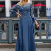 Este vestido fluido con falda de capa de gasa es ideal para madrinas que buscan una combinación de sofisticación y movimiento. Tul bordado con pedrería en las mangas crean un efecto visual impactante, mientras que el escote en V añade elegancia. Las capas, muy de moda esta temporada, aportan un toque actual y permiten un movimiento fluido.