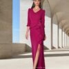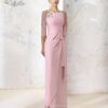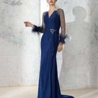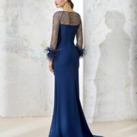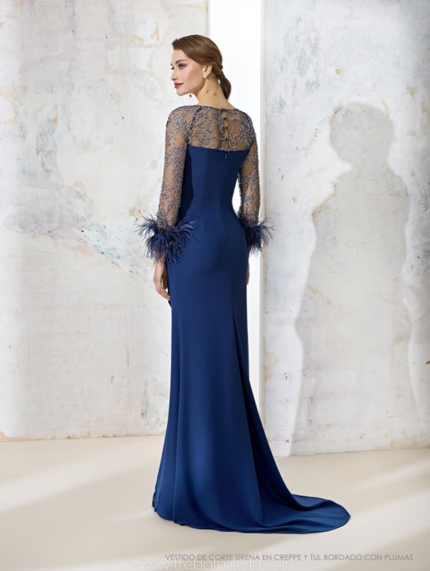 Vestido de fiesta largo efecto evasé confeccionado en crepe con mangas de encaje acabadas con puños de plumas (desmontables) y detalle de tul bordado en cintura