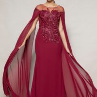Este sofisticado vestido de madrina es ideal para quienes buscan elegancia y movimiento en su atuendo. Las mangas tipo capa, una tendencia clave de esta temporada, aportan fluidez y un estilo etéreo al diseño, mientras que el escote efecto “tattoo” realza la silueta. El detalle bordado en pedrería en el cuerpo añade un toque delicado y femenino