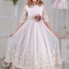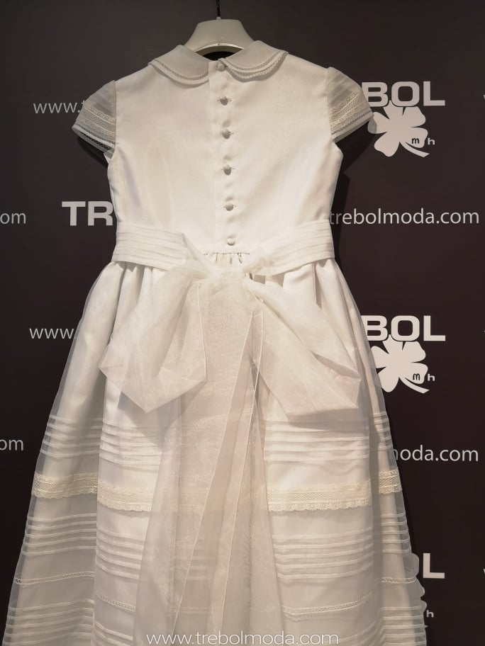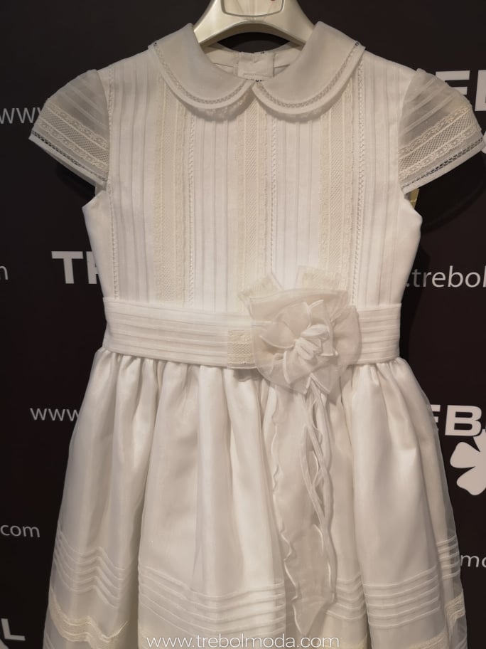 Vestido de comunión con cuello bebe. Un clásico por excelencia. Con falda y cuerpo de jaretas y puntillas. Confeccionado en organdi (100% poliester). Cerrado en espalda con botones y cinturón de lazada grande.
