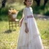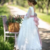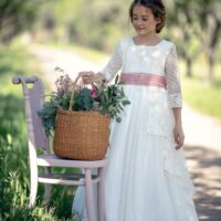 Este vestido de comunión combina elegancia y delicadeza, fabricado en tul marfil. Su cuerpo bordado destaca por su escote en espalda , aportando un toque sofisticado.