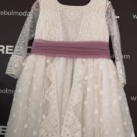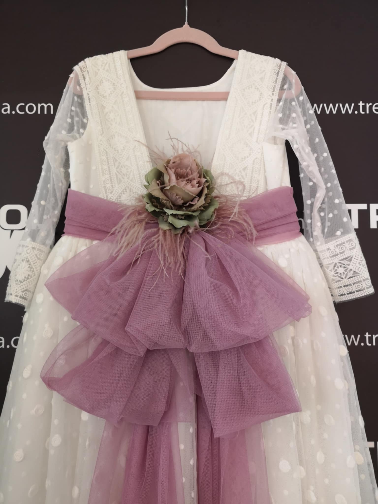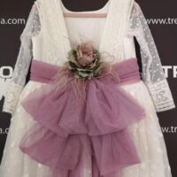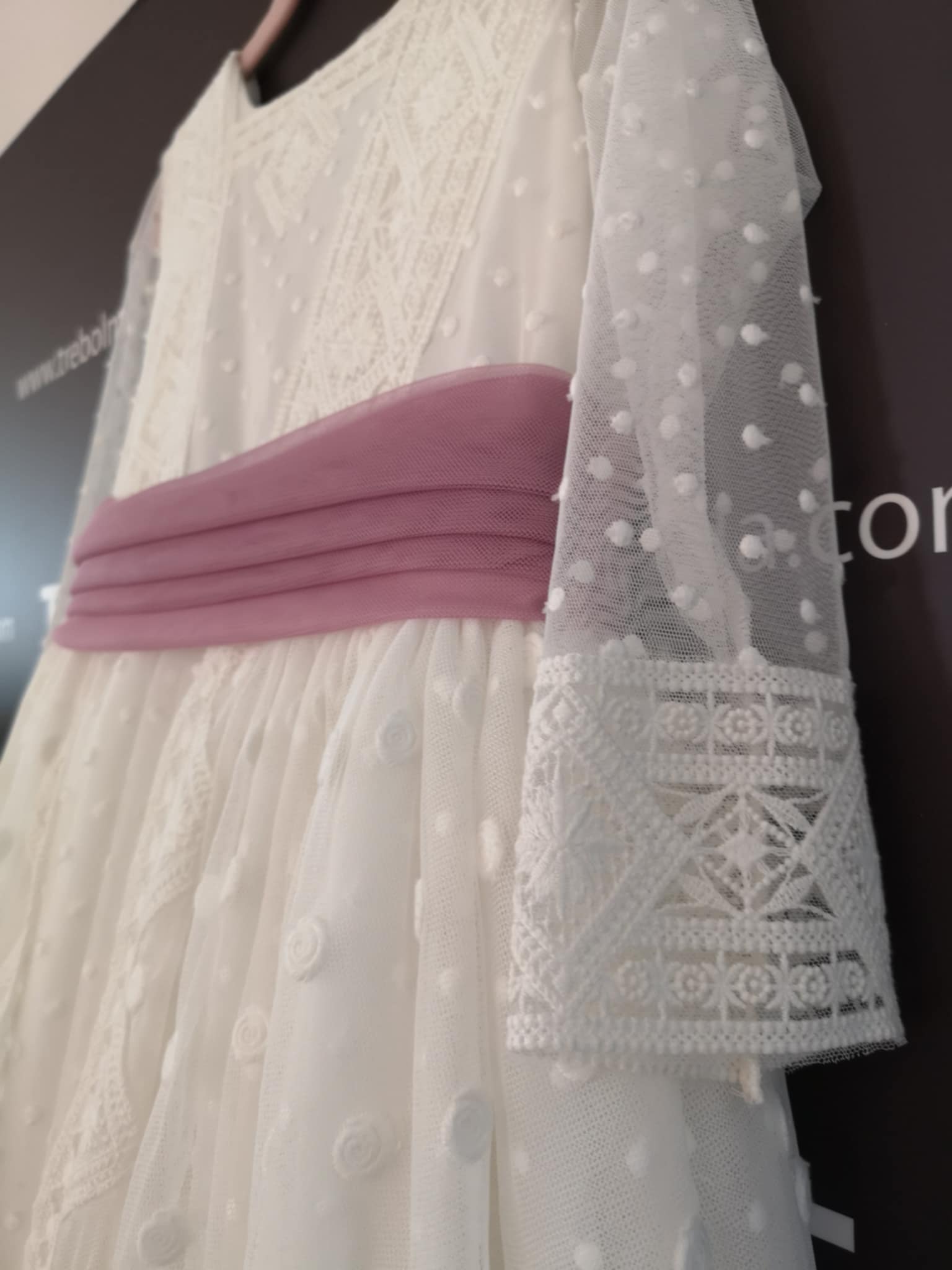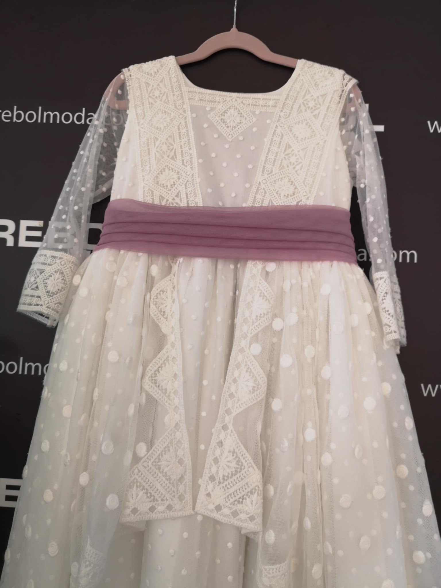 Este vestido de comunión combina elegancia y delicadeza, fabricado en tul marfil. Su cuerpo bordado destaca por su escote en espalda , aportando un toque sofisticado.