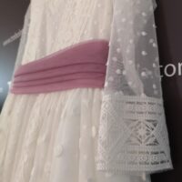 Un cinturón en tul rosa con un hermoso adorno de lazo en la espalda realza la cintura. La falda bordada, con un volante, añade movimiento y gracia a esta prenda especial.