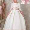 Vestido de comunión elaborado en delicado plumetti que aportan textura y elegancia. La falda cuenta con un rizo que añade un toque romántico.
