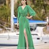 Este vestido largo combina encaje y elegancia, con un cuerpo en encaje buganvilla y una falda de suave caída. El escote en V y el cinturón con broche floral decorativo realzan la silueta. Ideal para madrinas que buscan un diseño romántico
