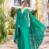 Este vestido ofrece una opción sobria y sofisticada, con un escote cruzado y detalle floral en la cintura (desmontable). Peplum en cintura para disimular barriguita. Mangas entreabiertas.Ideal para bodas elegantes