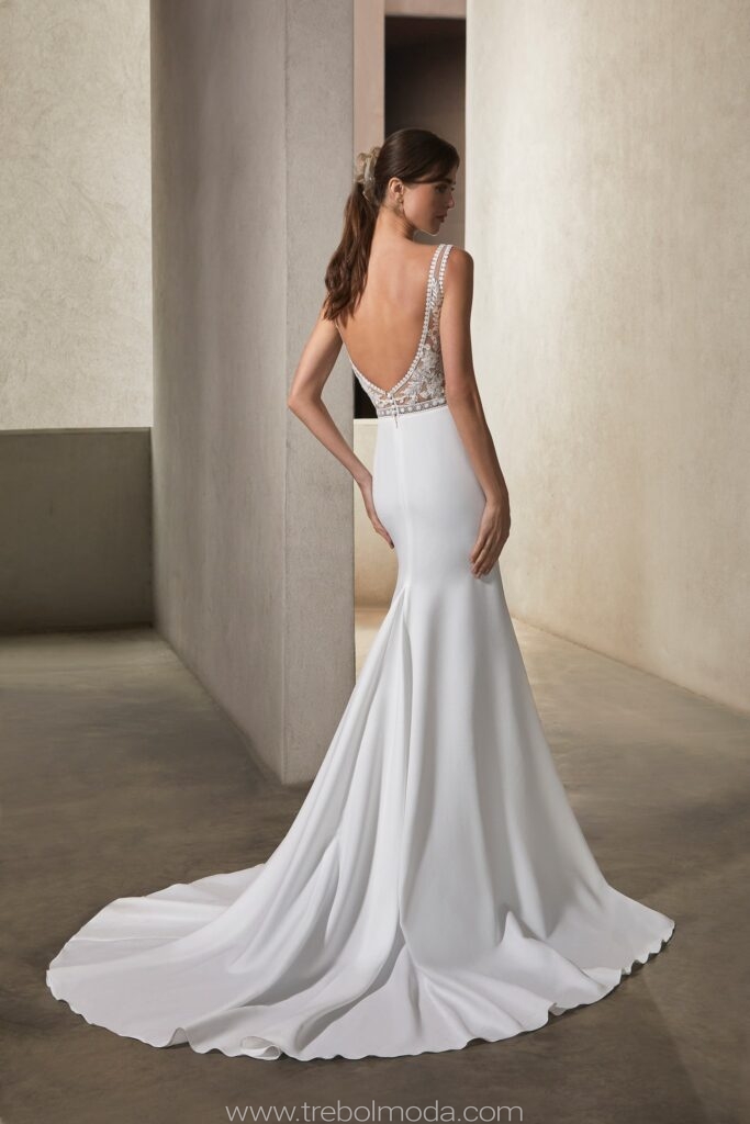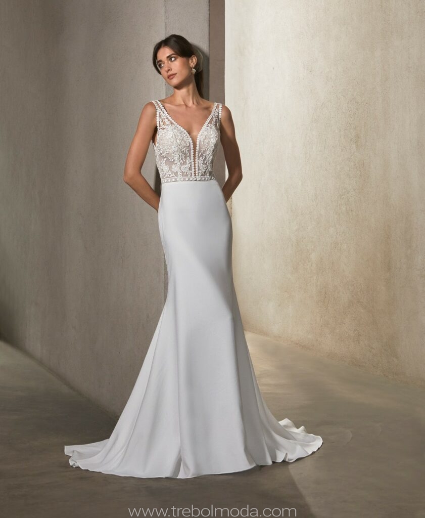 Romántica y femenina. Un sensacional vestido de novia con falda evasé de tul y cuerpo con aplicaciones de guipur y pedrería que descienden por la cintur. Los tirantes semitransparentes le dan un look sofisticado y muy femenino.