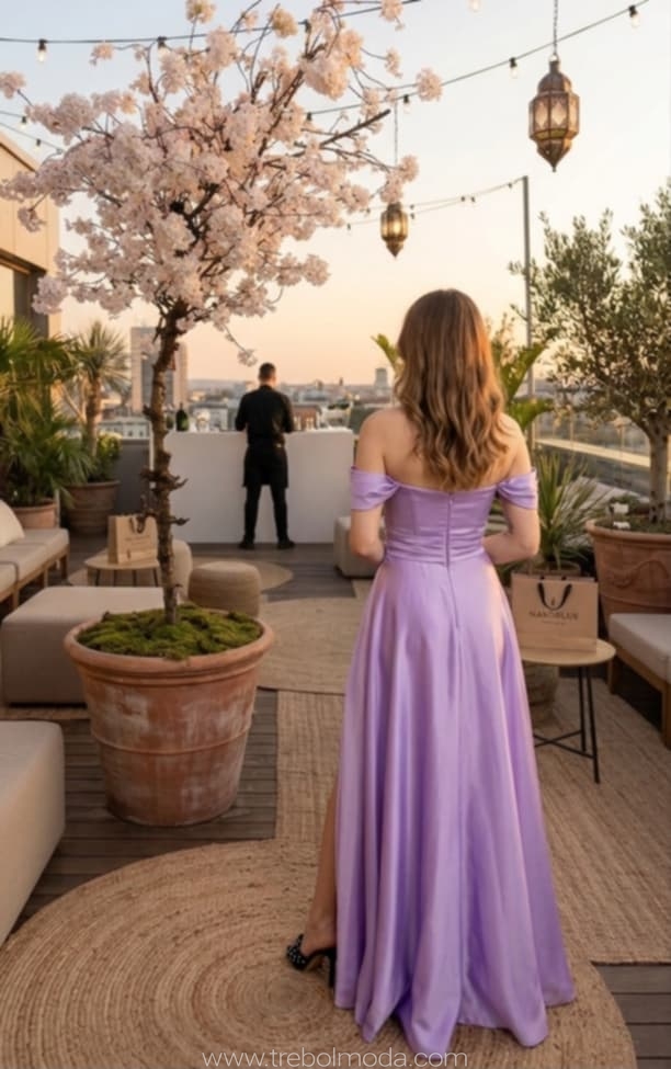 Ideal para un evento de tarde es este vestido largo con hombros semidescubiertos.