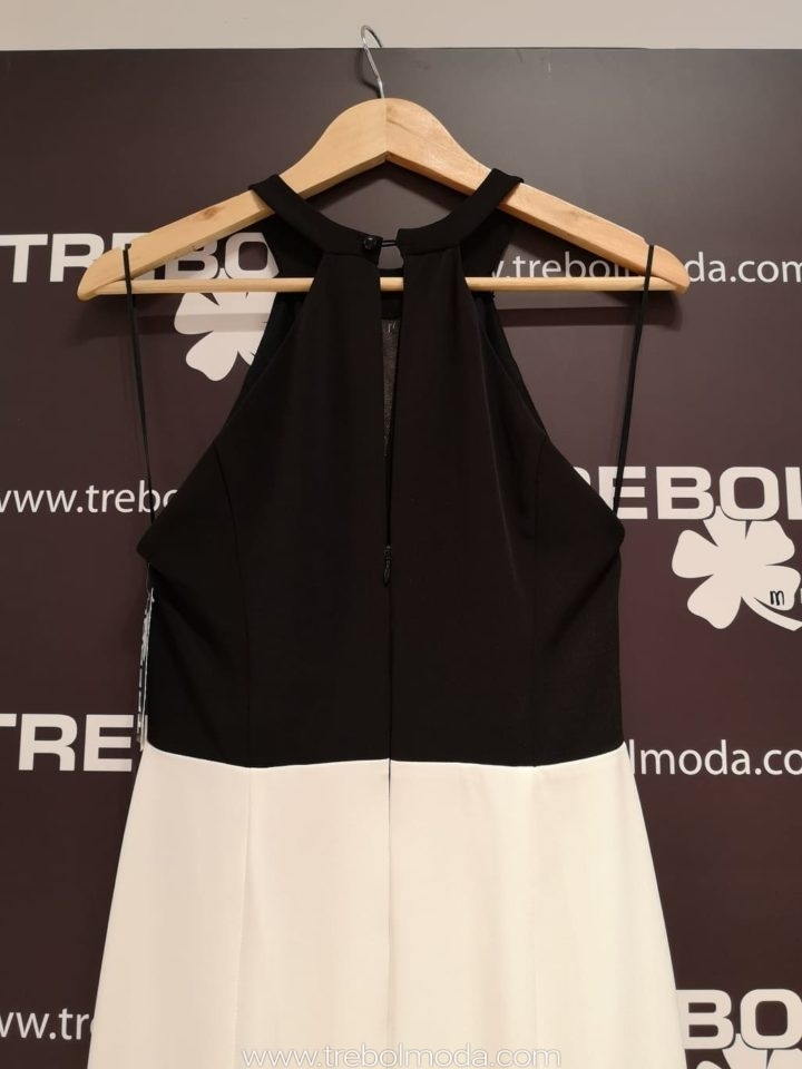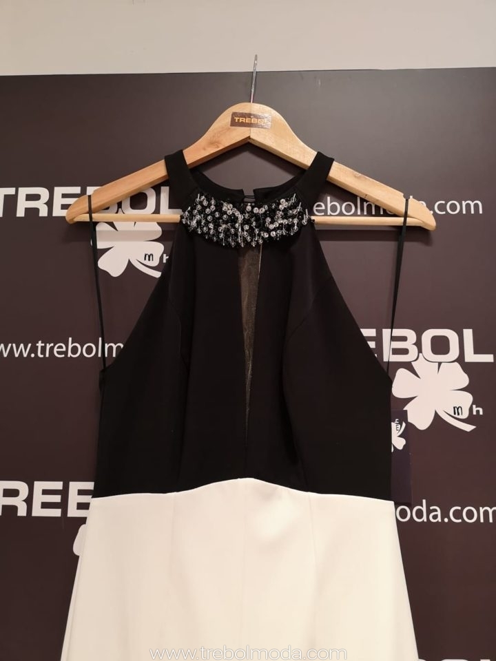 Vestido bicolor largo ultra elegante. Combinando en blanco la falda y el cuerpo en negro. Linea sirena. Cuello halter adornado con pedrerías.