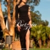 Vestido largo con cuerpo de guipur. Sugerente transparencias en escote palabra de honor. Falda recta con abertura. Cinturón (incluido) con hebilla de fantasía.