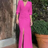 ¡Un modelo que nos vuelve locas! Su escote delantero en pico, su cintura drapeada y su falda midi con abertura lo convierten en un vestido muy #fashion.