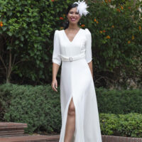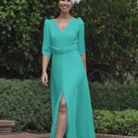 Así como su fajín drapeado en cintura (para disimular barriguita).