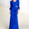Vestido largo de madrina en crepe con cuello “corazón” y manga larga.