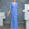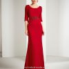 Este vestido largo de madrina con encaje en color burdeos destaca por su elegancia y sofisticación, con un delicado encaje chantilly francés en la parte superior que le aporta un toque refinado y lujoso. El diseño incluye mangas tres cuartos, un escote barco que realza la figura.
