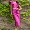 Falda drapeada y cruzada con abertura para estilizar y alargar las piernas.