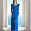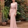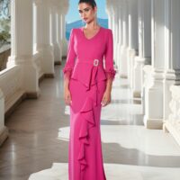 Este vestido en un vibrante magenta es ideal para madrinas de boda que desean proyectar una imagen sofisticada y actual. El diseño con mangas decoradas en flores y plumas le otorga un aire moderno, mientras que el escote en pico y las líneas del vestido brindan una silueta elegante y favorecedora.