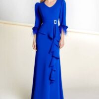 El diseño con mangas decoradas en flores y plumas (posibilidad de desmontar) le otorga un aire moderno, mientras que el escote en pico y las líneas del vestido brindan una silueta elegante y favorecedora.