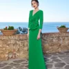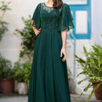Este vestido fluido con capas de gasa es ideal para madrinas que buscan una combinación de sofisticación y movimiento. Las capas en las mangas crean un efecto visual impactante, mientras que el escote en tul transparente añade elegancia. Las capas, muy de moda esta temporada, aportan un toque actual y permiten un movimiento fluido.
