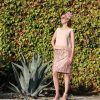 Vestido de punto elástico con mangas abiertas con hombros semi-descubiertos, escote delantero en pico y espalda cerrada con cremallera invisible. Incluye cinturón floral.