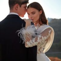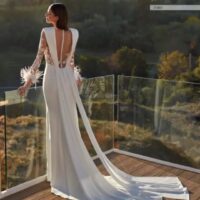 La sensualidad lleva su nombre. Un vestido que potencia el atractivo de la silueta femenina con un diseño sirena en crepe que centra toda la atención en el cuerpo tattoo en tul cristal y encaje, y el pronunciado escote en V creado a partir de dos tiras drapeadas que ascienden hasta las hombreras, que le aportan sofisticación y estructura al diseño.