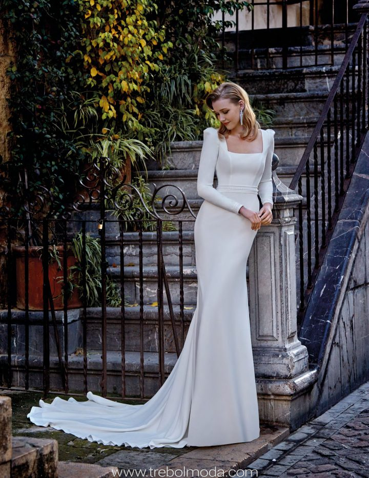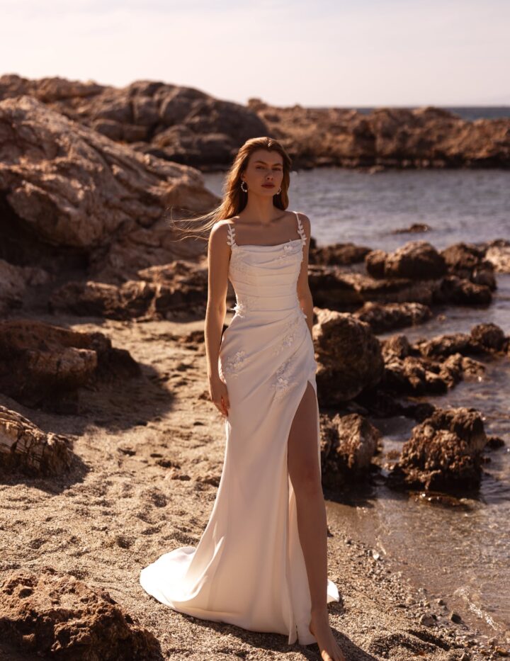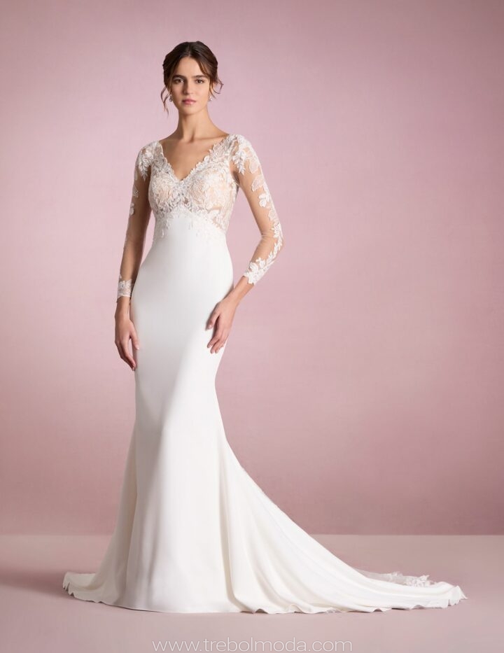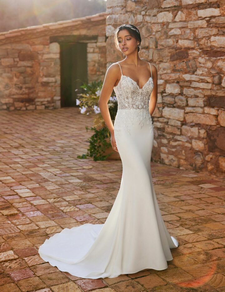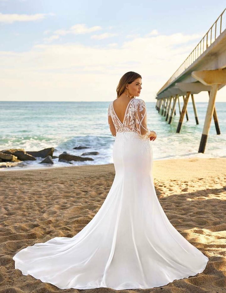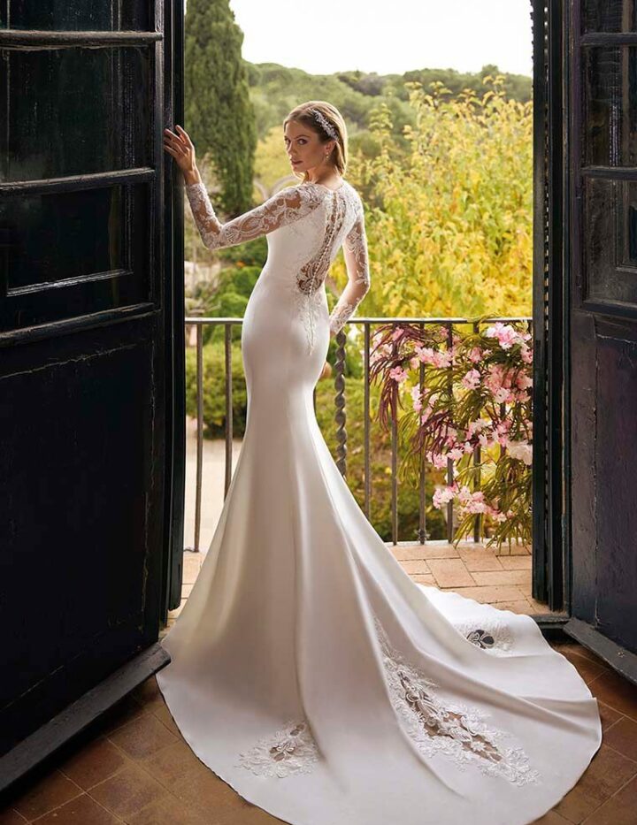 Las siluetas de 2026 son muy variadas. Desde el clásico corte princesa hasta el elegante corte sirena que acentúa la figura. También ganan protagonismo los vestidos de corte A, que favorecen a la mayoría de los cuerpos, y los diseños rectos de inspiración slip dress con un aire de los años 90, perfectos para una boda civil.