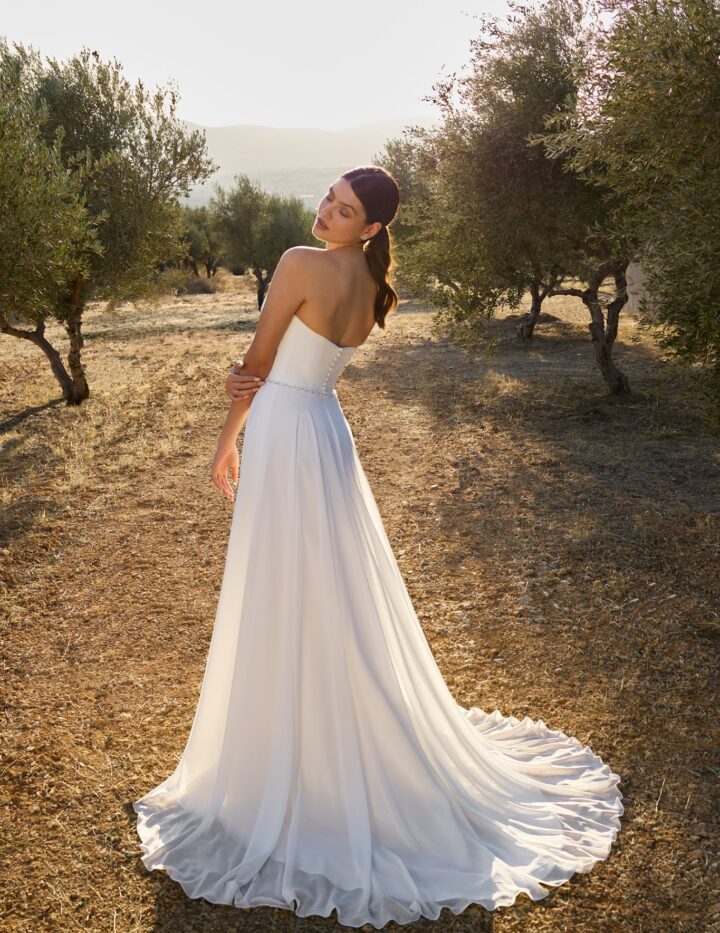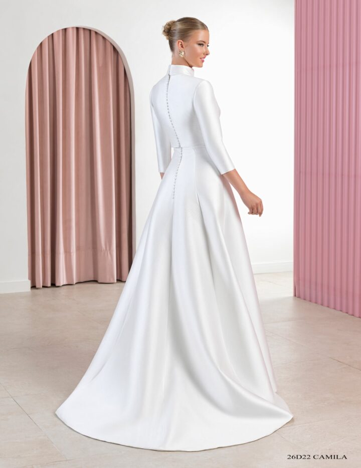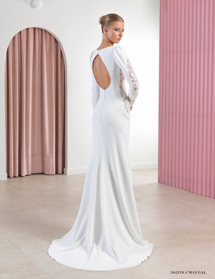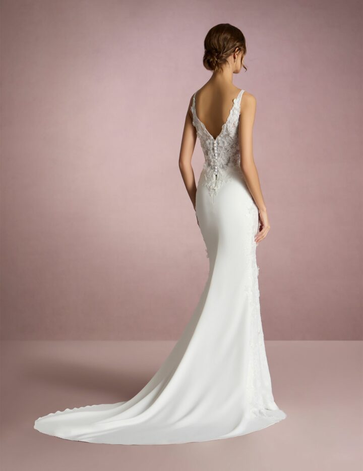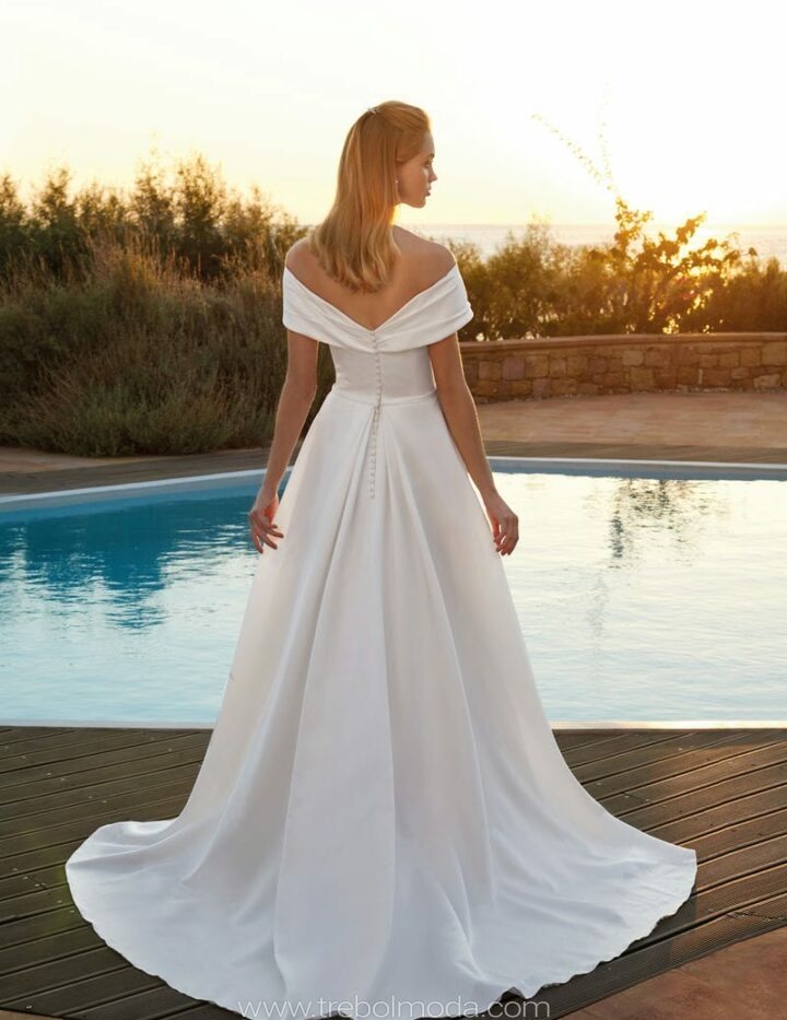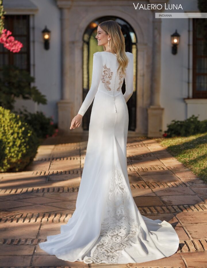 Las siluetas de 2026 son muy variadas. Desde el clásico corte princesa hasta el elegante corte sirena que acentúa la figura. También ganan protagonismo los vestidos de corte A, que favorecen a la mayoría de los cuerpos, y los diseños rectos de inspiración slip dress con un aire de los años 90, perfectos para una boda civil.