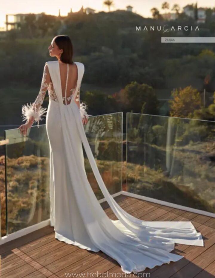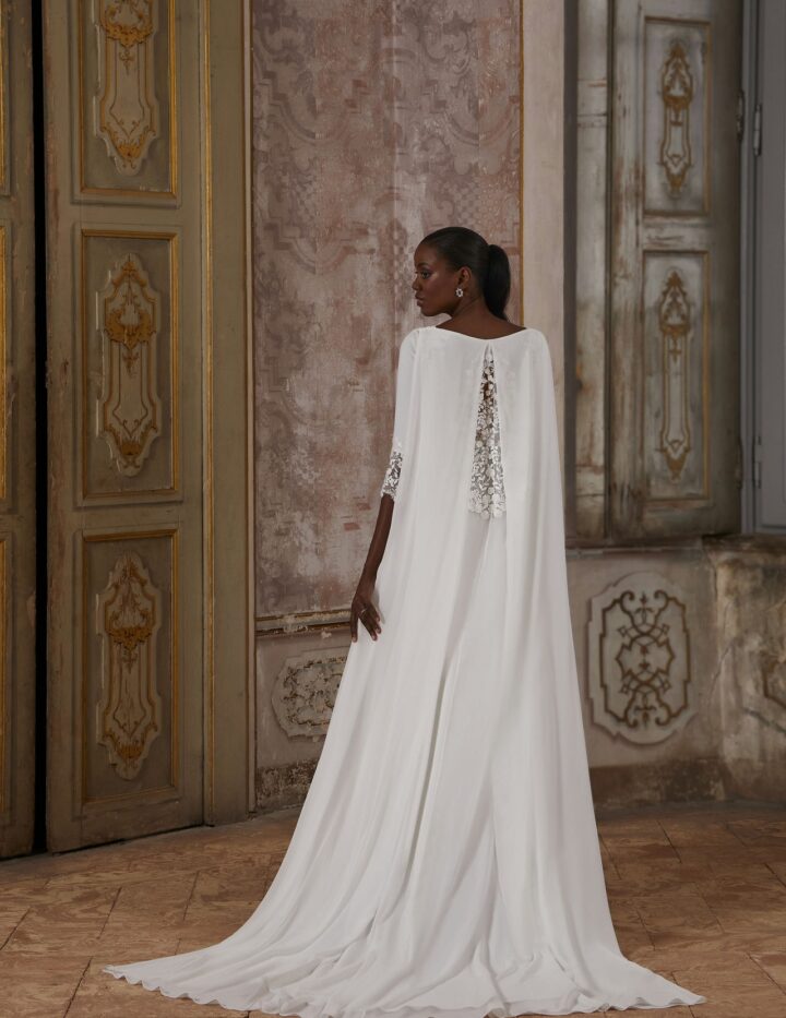 - Las capas: Convierten un vestido minimalista en uno dramático y elegante. Son una alternativa moderna al velo y perfectas para un “efecto wow” en la entrada.